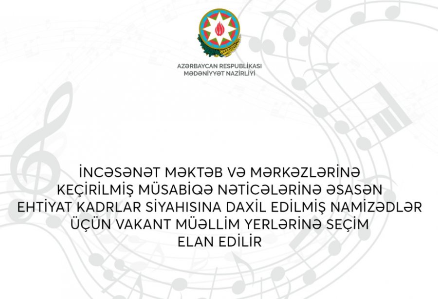 Mədəniyyət Nazirliyi incəsənət məktəb və mərkəzlərinə keçirilmiş müsabiqə nəticələrinə əsasən ehtiyat kadrlar siyahısına daxil edilmiş namizədlər üçün vakant müəllim yerlərinə seçim elan edib.