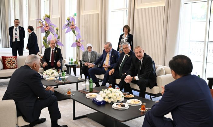 Liderlər toplantı öncəsi çay masası ətrafında söhbət ediblər.