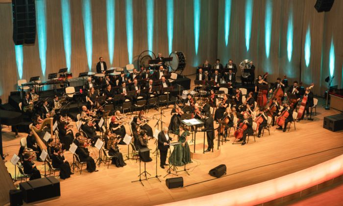 Səhnədə Üzeyir Hacıbəyli adına Dövlət Simfonik Orkestrini tanınmış italiyalı dirijor Françesko İvan Çampa (Francesco Ivan Ciampa) idarə edib.