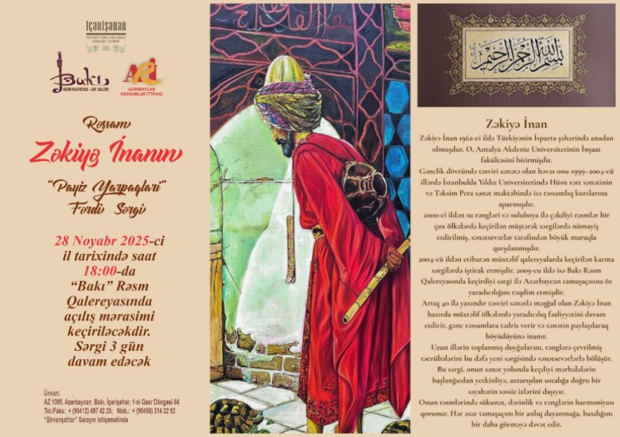 Noyabrın 28-də qalereyada türkiyəli rəssam Zəkiyə İnanın “Payız yarpaqları” adlı fərdi yaradıcılıq sərgisi açılacaq.