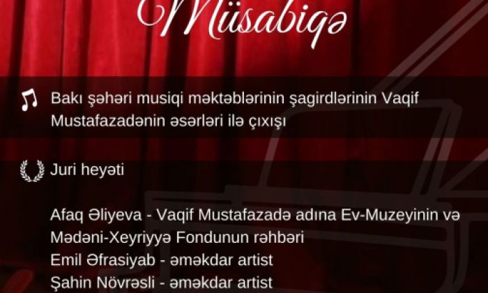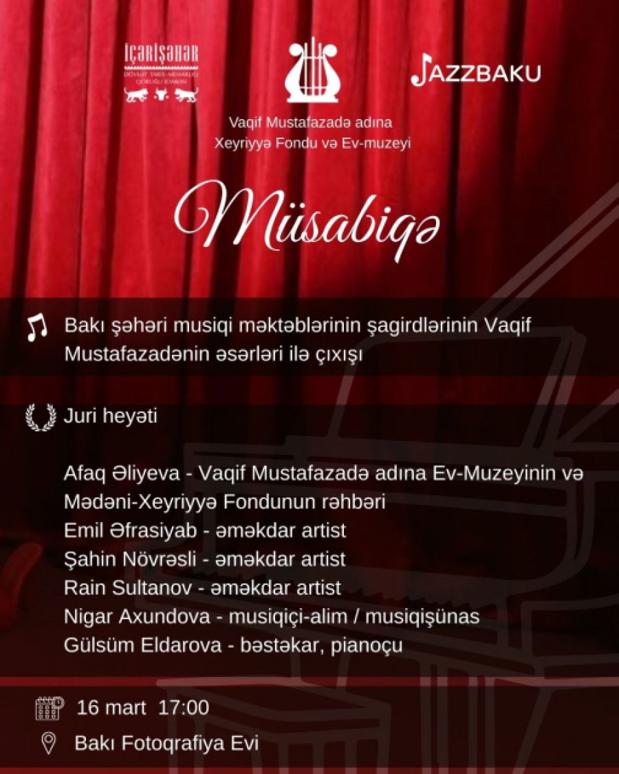 "Fotoqrafiya Evi"ndə isə Bakı şəhəri musiqi məktəbləri şagirdlərinin caz musiqisi ifaçılığı üzrə müsabiqəsi keçiriləcək. Onların ifalarını musiqi və incəsənət xadimlərindən ibarət münsiflər heyəti qiymətləndirəcək.