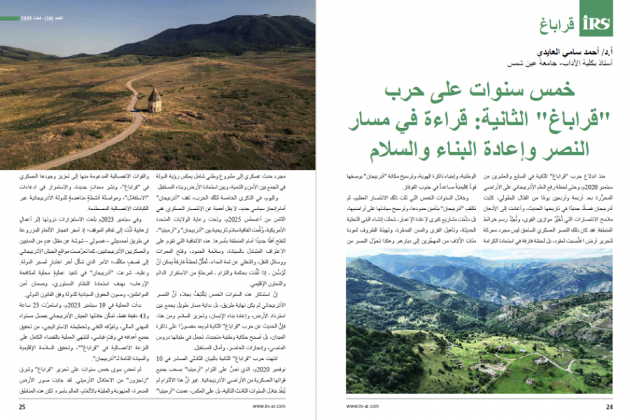 Misirin Ayn Şəms Universitetinin professoru, filologiya üzrə fəlsəfə doktoru, azərbaycanşünas-alim Əhməd Sami əl-Aydinin “İkinci Qarabağ müharibəsinin 5 ili: Qələbə, yenidənqurma və sülh yoluna baxış” məqaləsində işğaldan azad olunmuş ərazilərdə aparılan bərpa işləri və gələcək inkişaf perspektivləri təqdim edilib.