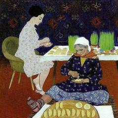 Tanınmış rəssam Ələkbər Rzaquliyev yaradıcılığında xalqımızın məişət və etnoqrafik ənənələrini böyük ustalıqla tərənnüm etməkdən yorulmamışdır. Rəssamın "Köhnə Bakı" silsiləsinə aid əsərlərinin hər biri bədii estetik məziyyətləri ilə yanaşı, həmçinin, özünəməxsus dəqiq işlənilmə xüsusiyyətləri ilə də seçilir. “Gəlinə hədiyyə ilə” adlı əsərində rəssam Novruz bayramı ərəfəsində bayram şirniyyatları ilə dolu xonça ilə qız evinə bayram görüşünə tələsən ailənin bədii görüntülərini təsvir edib. İçərişəhərin fonunda milli geyimli ailə üzvlərinin fərdi xarakterik xüsusiyyətləri incə cizgi, ştrix elementləri ilə ustalıqla əks etdirilib.
