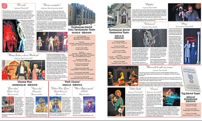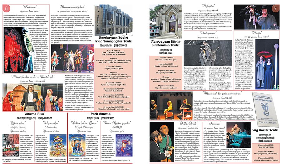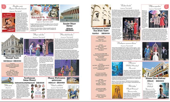 Ənənəvi və Yeni il bayramının ab-havasına uyğun olaraq yanvarın ilk həftəsinin tədbirləri daha çox uşaqlara ayrılır, repertuarlar bu yöndə tərtib edilir. Təbii ki, uşaqlara məxsusi diqqətlə bərabər böyüklər, onların mədəni istirahəti, sənət zövqü də unudulmur. 2019-cu ilin yanvar ayında paytaxtın mədəniyyət məkanlarının repertuarı da bu baxımdan zəngindir. Bütün bu zənginliklə isə “Mədəniyyət” qəzetinin “Afişa” əlavəsinin bayram öncəsi çapdan çıxan yanvar sayında ətraflı tanış olmaq olar.