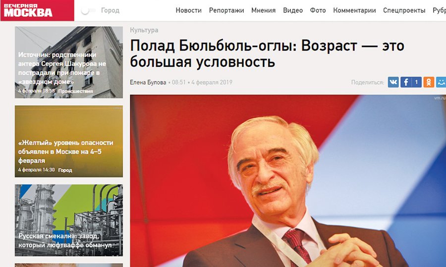 Fevralın 4-də Azərbaycanın Rusiya Federasiyasındakı səfiri, Xalq artisti, görkəmli müğənni və bəstəkar Polad Bülbüloğlunun 74 yaşı tamam oldu. Ad günü münasibətilə “Veçernyaya Moskva” (“Вечерняя Москва”) qəzeti diplomat və musiqiçidən qısa müsahibə alıb.