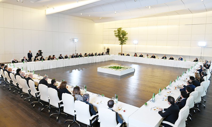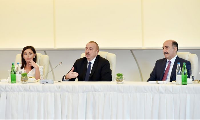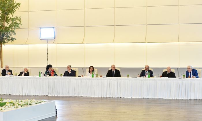 Prezident səslənən bütün məsələlərə münasibətini bildirib, müvafiq tapşırıqlar verib: “Bugünkü görüş bir daha onu göstərir ki, bunun çox böyük faydası var. Çünki burada qaldırılan məsələlər doğrudan da vacibdir və hesab edirəm ki, bu məsələlərin həlli bir çox mətləblərə aydınlıq gətirə bilər. Mən artıq mədəniyyət nazirinə göstəriş vermişəm, eyni zamanda, Prezident Administrasiyasına da göstəriş verirəm ki, burada səslənən bütün təkliflər təhlil olunsun, bir proqram halına salınsın və biz bu məsələləri ardıcıl olaraq həll edə bilək”.