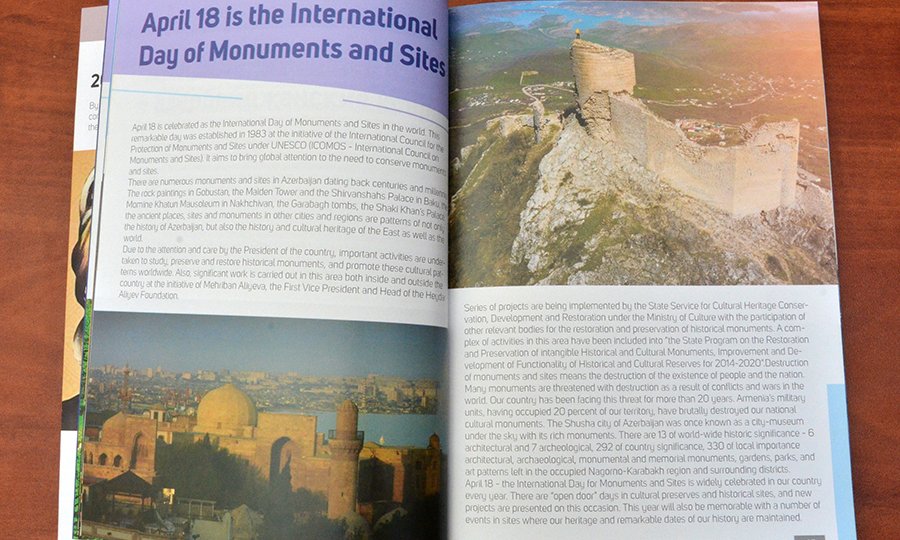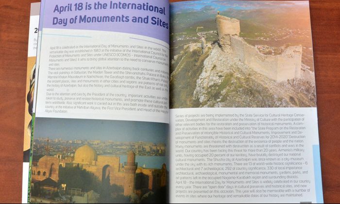 Aprelin 18-i Beynəlxalq abidələr və tarixi yerlər günüdür. UNESCO yanında Abidələrin və tarixi yerlərin mühafizəsi üzrə Beynəlxalq Şuranın təşəbbüsü ilə təsis olunan bu gün hər il ölkəmizdə də qeyd olunur. Bu mövzuya dair yazıda Azərbaycanın qədim abidələr diyarı olduğu, Naxçıvanda Möminə xatın türbəsi, Şəki xanlarının sarayı, Bakıda Şirvanşahlar saray kompleksi kimi abidələrin Şərq və dünya memarlığının möhtəşəm nümunələri kimi tanındığı diqqətə çatdırılır, tarixi abidələrin tədqiqi, mühafizəsi və bərpası ilə bağlı görülən işlərdən söz açılır.