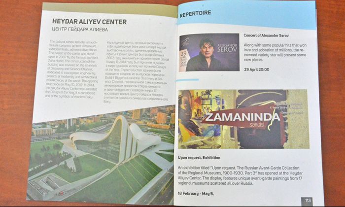 “Baku Guide”ın yeni nəşri də ingilis və rusdilli oxuculara mədəniyyətimizin bələdçiliyini edir. Aprel buraxılışında ölkəmizin mədəni həyatı, o cümlədən paytaxtın teatr və konsert müəssisələrinin repertuarı, muzey və sərgi salonlarının afişası, Bakının və bölgələrimizin tarixi-mədəni irs məkanları oxuculara təqdim olunur.