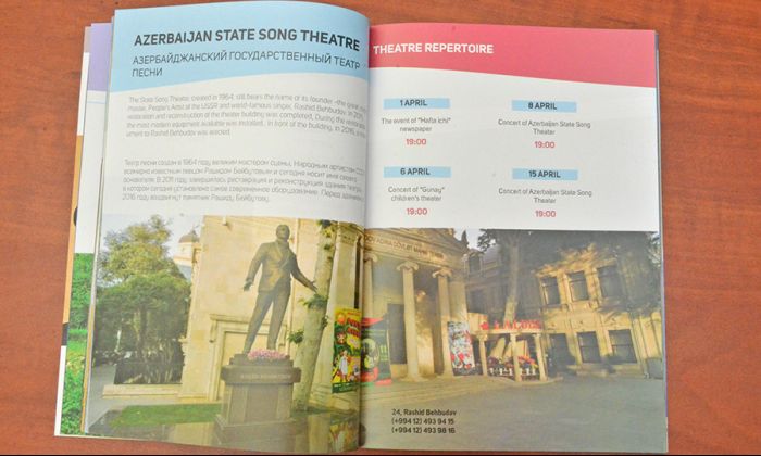 Nəşrdə paytaxtda fəaliyyət göstərən teatrlar, konsert məkanları, muzeylər, kino və sərgi zallarının aprel ayı üzrə afişası ilə yanaşı, hər bir mədəniyyət ocağı, onların yerləşdiyi tarixi binalar haqqında yığcam informasiya, ünvan və telefon nömrələri, Azərbaycan Milli Kitabxanası, 2018-ci ildən fəaliyyət göstərən Bakı Kitab Mərkəzi haqqında məlumat verilir. Həmçinin Bakının tarixi və müasir memarlıq nümunələri, İçərişəhər, minilliklərin daş yaddaşı olan Qobustan qoruğundan da bəhs olunur.