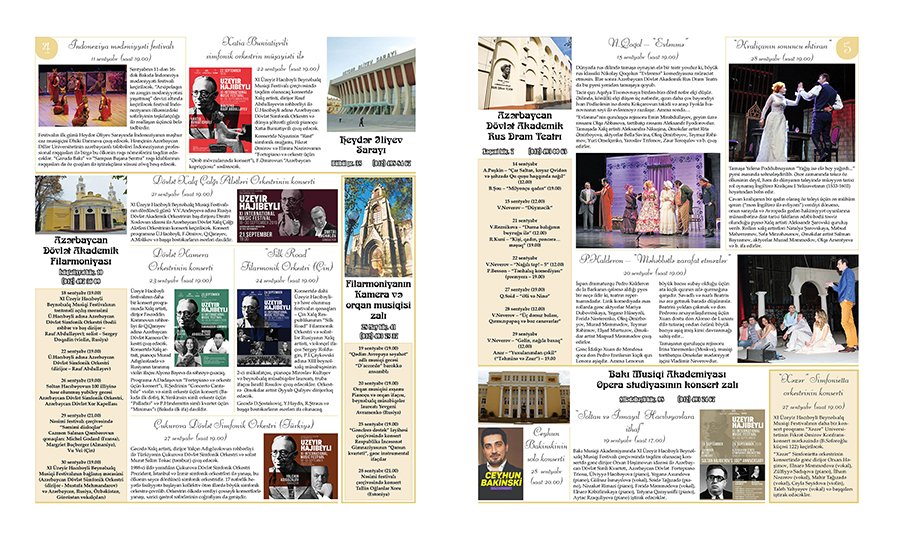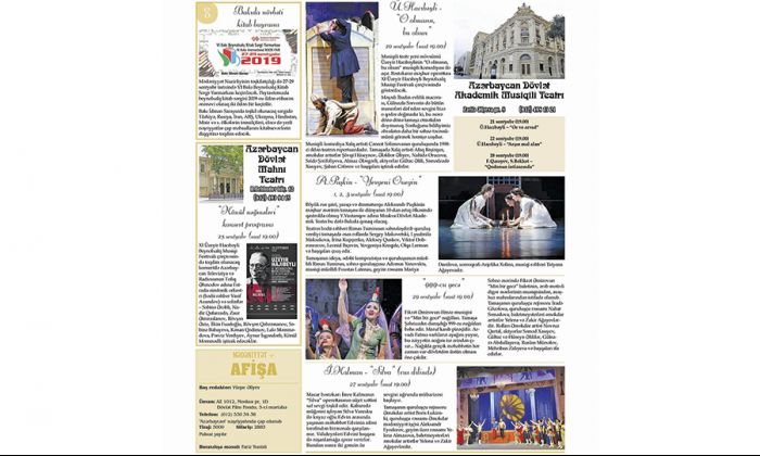 Teatr-konsert müəssisələrində yeni mövsümlə bərabər “Mədəniyyət” qəzetinin aylıq “Afişa” əlavəsi də yenidən sənətsevər oxucuların görüşünə gəlib. Ənənəvi olaraq bu il də ölkəmizdə musiqi mövsümü dahi Üzeyir Hacıbəylinin adını daşıyan festivalla başlanır. XI Üzeyir Hacıbəyli Beynəlxalq Musiqi Festivalı həm müddəti, həm də iştirakçı və tədbirlər sayının çoxluğu ilə öncəki illərdən fərqlənəcək.