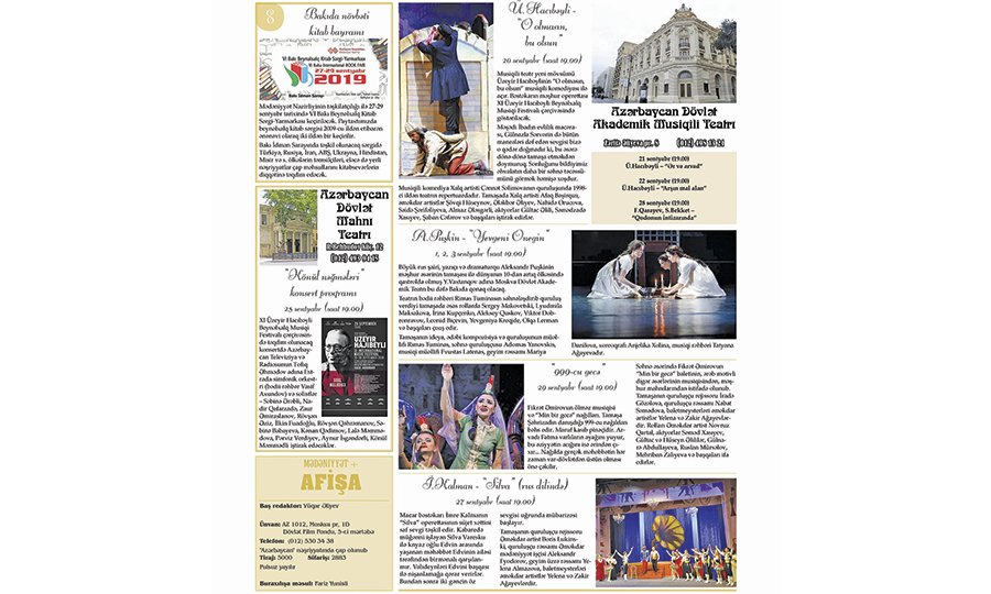 Akademik Opera və Balet Teatrı, Akademik Musiqili Teatr da pərdələrini Üzeyir bəyin əsərləri ilə açacaq. Ümumilikdə isə teatrların yeni mövsümün ilk ayı üçün maraqlı repertuarı var. Bütün bunlar, eləcə də paytaxtın digər mədəniyyət ocaqlarının sentyabr sayı üçün repertuar və tədbirləri “Afişa”nın yeni sayında əksini tapıb. Odur ki, mənalı mədəni istirahət üçün paytaxtın incəsənət həyatında nəyin harada və nə vaxt olacağını öyrənməyə dəyər.