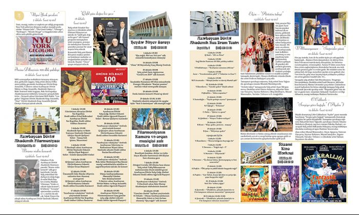 Bir sözlə, dekabr ayının mədəniyyət mənzərəsi olduqca rəngarəngdir və uşaqdan böyüyə hər kəsin marağına uyğun geniş seçim imkanları var. “Mədəniyyət” qəzetinin “Afişa” əlavəsi isə sizlərə bu işdə bələdçilik edə bilər.