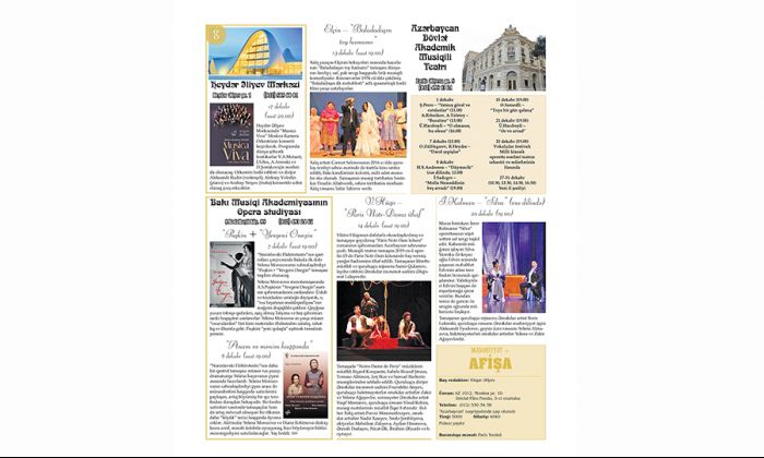 “Afişa” əlavəsinin dekabr sayında Akademik Opera və Balet, Akademik Milli Dram, Akademik Musiqili, Akademik Rus Dram, Gənc Tamaşaçılar, Kukla, Yuğ, Pantomima teatrlarının, eləcə də Şuşa Dövlət Musiqili Dram Teatrının göstərəcəyi  tamaşalar barədə ətraflı məlumat almaq mümkündür. Bundan əlavə, ay ərzində Heydər Əliyev Sarayı, Azərbaycan Dövlət Akademik Filarmoniyası, Kamera və Orqan Musiqisi Zalı, Heydər Əliyev Mərkəzi, Beynəlxalq Muğam Mərkəzi, Dövlət Mahnı Teatrı və Bakı Musiqi Akademiyasının Opera studiyasında təqdim olunacaq konsertlər də diqqətə çatdırılır. Nizami Kino Mərkəzində ekrana çıxan filmlər, yaxud Bakı Dövlət Sirkindəki yeni proqram barədə məlumat almaq istəyənlər də nəşrdən yararlana bilərlər. Teatrların aylıq afişası ilə bərabər, ayrı-ayrı tamaşaların mövzusu, yaradıcı heyəti, həmçinin konsertlər, sərgilər və s. haqqında təqdimat yazıları, anons-informasiyalar da verilib.