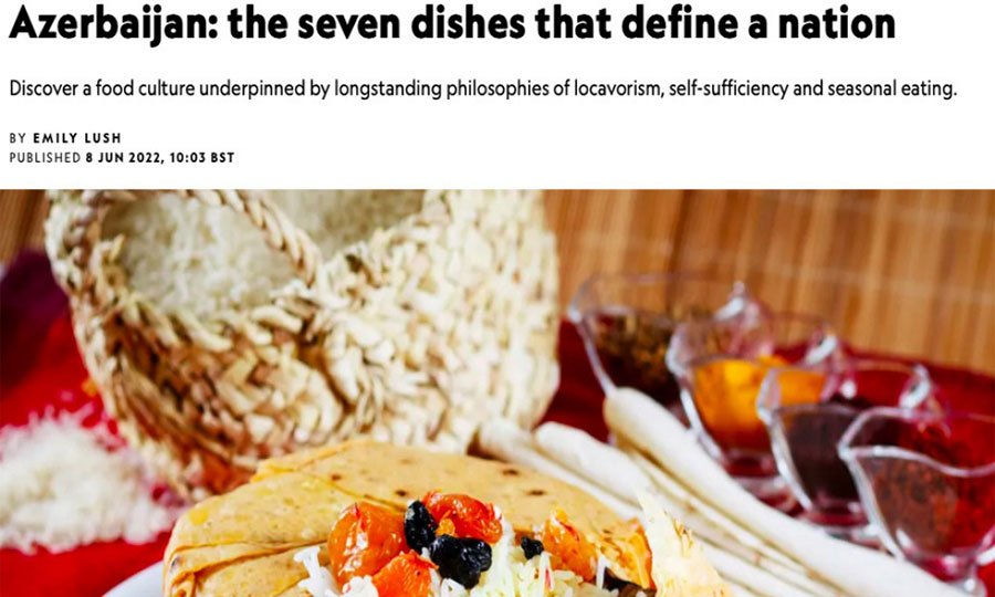 Müəllif Emili Luş yazdığı məqalədə Azərbaycan mətbəxinin yeməklərinin rəngarəngliyindən və zənginliyindən söz açır. Qeyd olunur ki, Azərbaycanı əhatə edən doqquz iqlim qurşağı insanlara çoxlu təzə məhsullar, o cümlədən şaftalı, nar, alma, əncir, zəfəran və şirin bibərlə təmin edir.