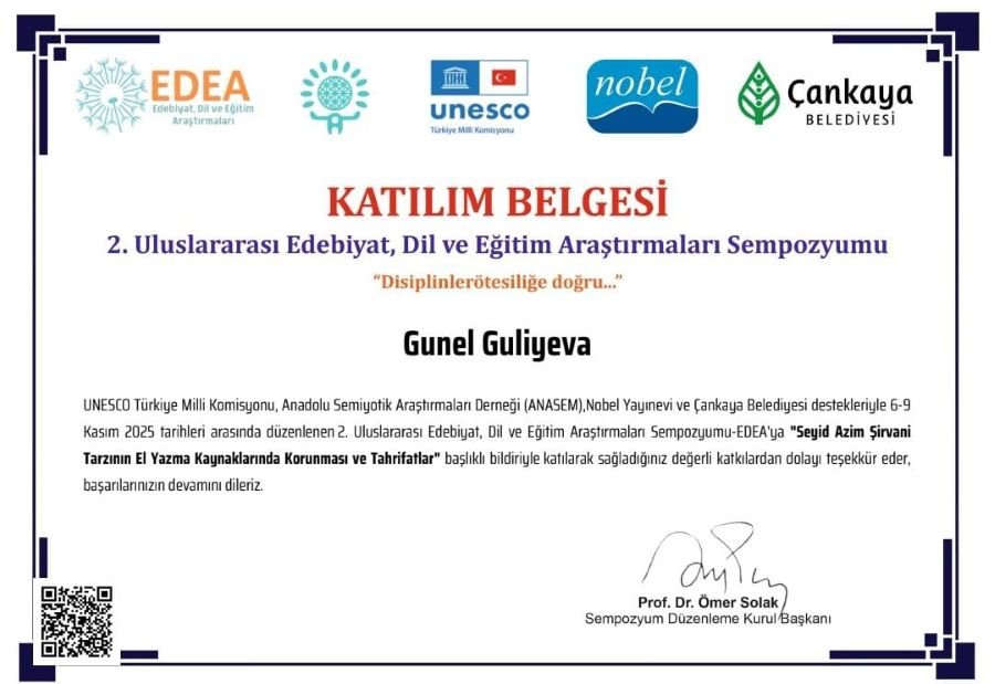 AMEA Məhəmməd Füzuli adına Əlyazmalar İnstitutunun Nizami Gəncəvi Əlyazmalarının tədqiqi şöbəsinin böyük elmi işçisi Günel Quliyeva 6-9 noyabr tarixlərdə Ankarada keçirilmiş “Transdisiplinarlığa doğru...” II Beynəlxalq Ədəbiyyat, Dil və Təhsil Araşdırmaları Simpoziumunda onlayn şəkildə iştirak edib.