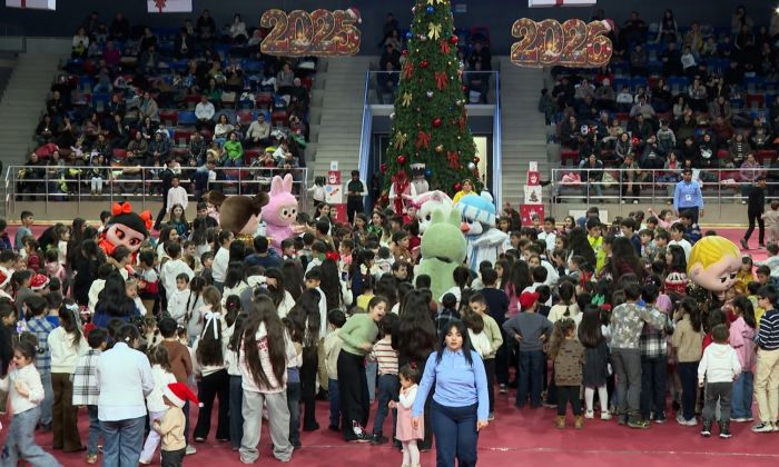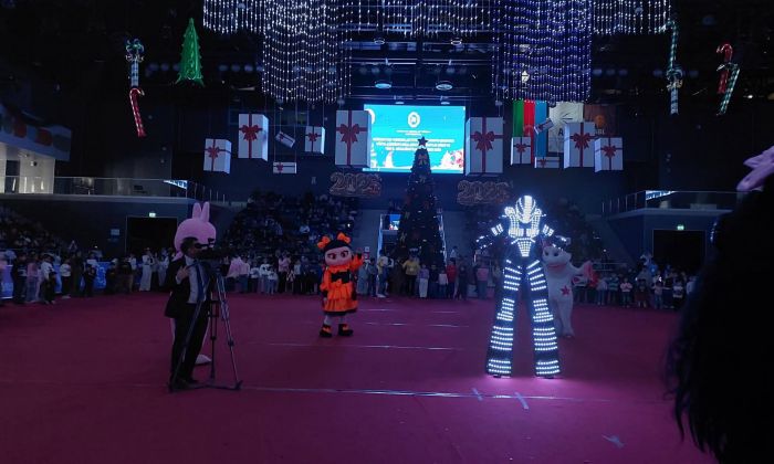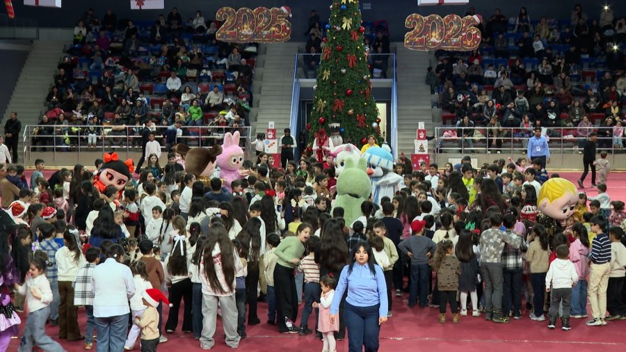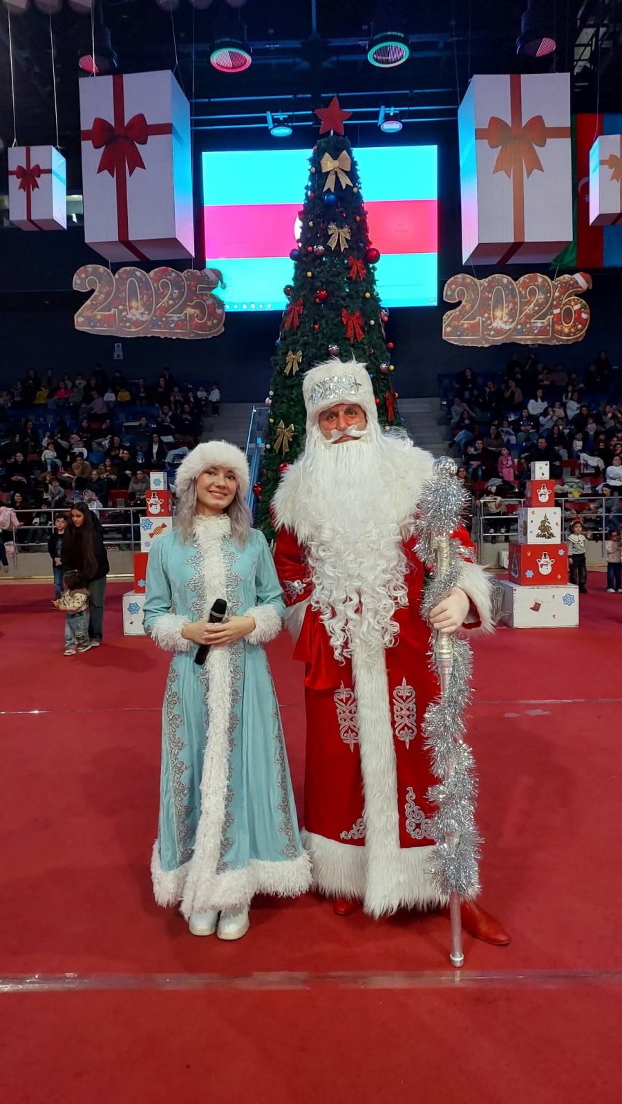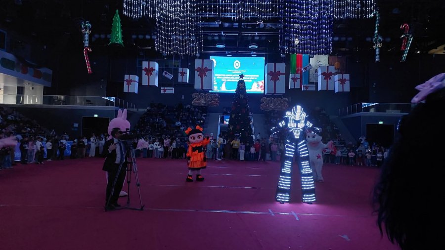 Uşaqlar idman sarayının mərkəzində qurulmuş böyük yolkanın ətrafında Şaxta baba və Qar qızla birgə rəqs edir, müxtəlif əyləncəli oyunlar oynayırlar.