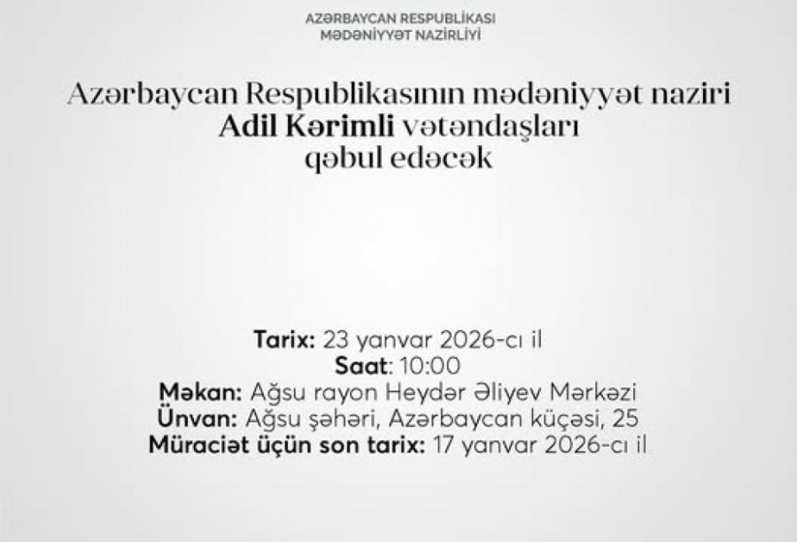 Mədəniyyət naziri Adil Kərimli yanvarın 23-də saat 10:00-da Ağsu rayon Heydər Əliyev Mərkəzində (ünvan: Ağsu şəhəri, Azərbaycan küçəsi, 25 ) Ağsu, Şamaxı, Qobustan və İsmayıllı rayonlarından vətəndaşların müraciətlərini dinləyəcək.
