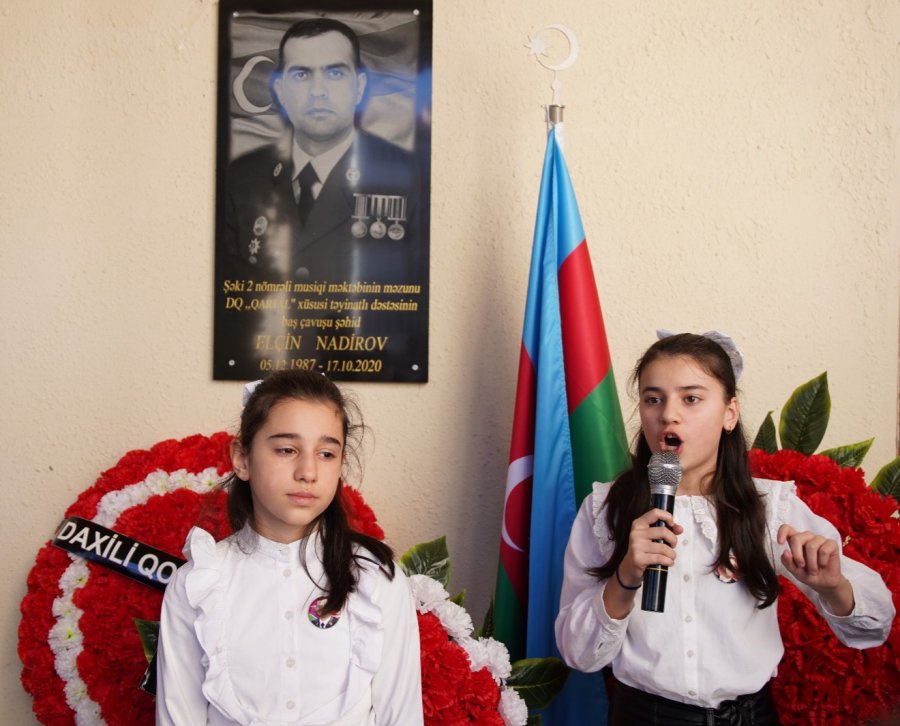 Şəki şəhər 2 nömrəli Uşaq musiqi məktəbində (Şəki-Zaqatala Regional Mədəniyyət İdarəsi) ölkəmizin ərazi bütövlüyü uğrunda mərdliklə döyüşərək şəhid olmuş Daxili Qoşunların hərbi qulluqçusu baş çavuş Elçin Nadirovun (1987–2020) xatirə lövhəsinin açılışı olub.