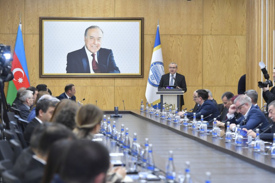 BDU-nun rektoru Elçin Babayev giriş sözündə diqqətə çatdırıb ki, Ulu öndər Heydər Əliyevin təşəbbüsü ilə 1995-ci ildə hazırlanan Konstitusiyada Azərbaycan dili dövlət dili kimi təsdiq olunub. Bu, ana dilimizin hüquqi statusunun möhkəmləndirilməsi və onun cəmiyyətin bütün sahələrində tam şəkildə işlədilməsinin təmin olunması baxımından mühüm tarixi hadisədir. Heydər Əliyev gənclərimizin öz ana dilinə hörmətlə yanaşmasını daim vurğulayıb, ziyalılarla, ədəbi dil xadimləri ilə keçirdiyi görüşlərdə Azərbaycan dilinin saflığının qorunmasının, onun yad təsirlərdən uzaq saxlanmasının vacibliyini xüsusi qeyd edib: "Bu məqsədyönlü dil siyasəti Prezident İlham Əliyev tərəfindən davam etdirilir. Azərbaycan dilinin qorunması, onun tətbiq dairəsinin genişləndirilməsi və daha da təkmilləşdirilməsi istiqamətində qəbul edilən sənədlər dilçilik elminin inkişafına, ədəbi dil normalarının möhkəmlənməsinə, eləcə də ana dilimizin cəmiyyətin bütün sahələrində düzgün və səmərəli istifadəsinə böyük töhfə verib”.