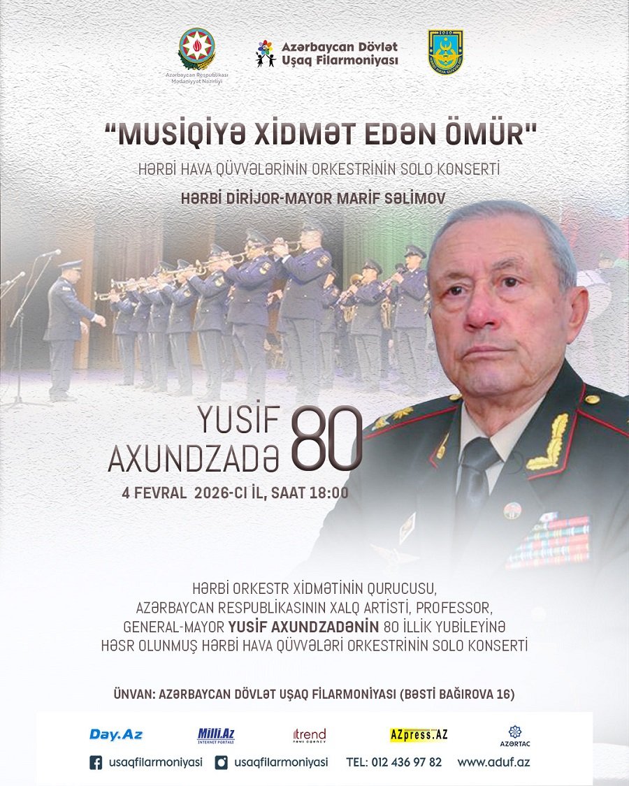 Fevralın 4-də Azərbaycanda hərbi orkestr xidməti və musiqi sənətinin görkəmli nümayəndəsi, general-mayor, professor, Xalq artisti Yusif Axundzadənin 80 illik yubileyi Azərbaycan Dövlət Uşaq Filarmoniyasında qeyd olunacaq.