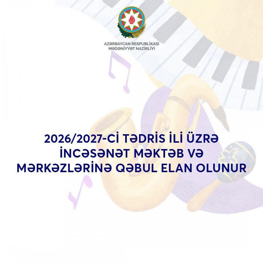 Azərbaycan Respublikası Mədəniyyət Nazirliyi və Naxçıvan Muxtar Respublikası Mədəniyyət Nazirliyinin tabeliyində fəaliyyət göstərən incəsənət məktəb və mərkəzlərinə 2026/2027-ci tədris ili üzrə təhsilalanların qəbulu elan olunub.