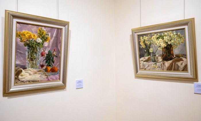 Ekspozisiyada müəllifin natürmort, portret və tematik tabloları xüsusi yer tutur. İlk zalda nümayiş olunan “Nərgizlər”, “Xrizantemlər”, “Astralar” kimi çiçək natürmortları rəssamın zərif kolorit duyumunu və rəng harmoniyasına həssas yanaşmasını parlaq şəkildə əks etdirir. Bu əsərlərdə gül ləçəklərinin incə fakturası və işıq-kölgə keçidləri poetik ovqat yaradır və tamaşaçını estetik bir aləmə aparır.