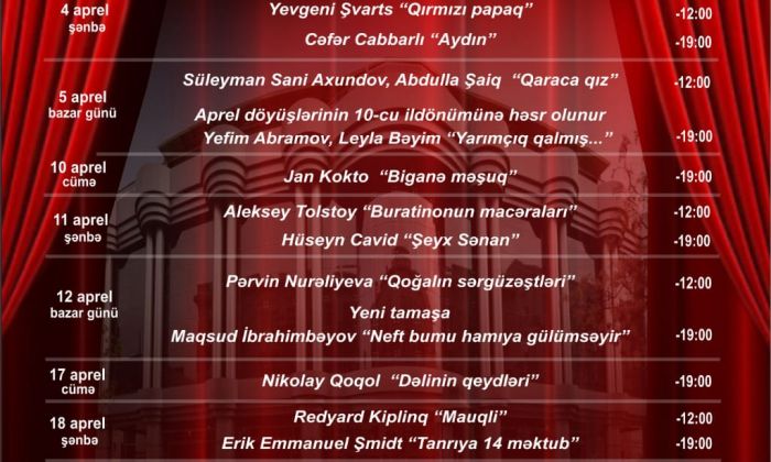 Aprelin 3-də İ.Tosovanın “Polkovnikə məktub” tamaşasının nümayişi nəzərdə tutulub.