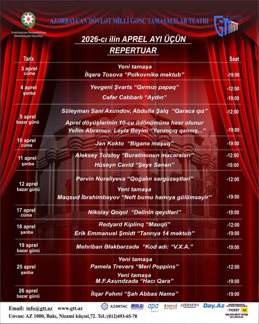 Azərbaycan Dövlət Milli Gənc Tamaşaçılar Teatrı aprel ayı üzrə repertuarını açıqlayıb.