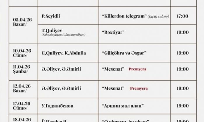 Akademik Musiqili Teatrın aprel ayı repertuarında “Molla Nəsrəddinin beş arvadı” (3 aprel), “Əliqulu bu gün evlənir” (4 aprel), “Bəxtiyar” (5 aprel), “Gülçöhrə və Əsgər” (10 aprel) və s. tamaşalar da var.