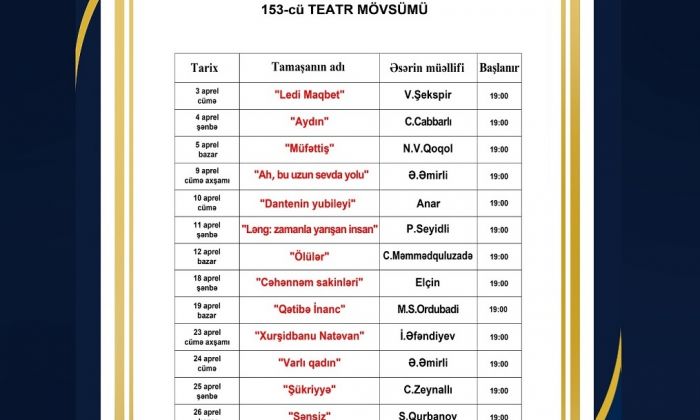 Bundan əlavə, aprel ayında Akademik Milli Dram Teatrının səhnəsində “Cəhənnəm sakinləri” (18 aprel), “Qətibə İnanc” (19 aprel), “Xurşidbanu Natəvan” (23 aprel), “Varlı qadın” (24 aprel), “Şükriyyə” (25 aprel) və “Sənsiz” (26 aprel) tamaşaları da olacaq.