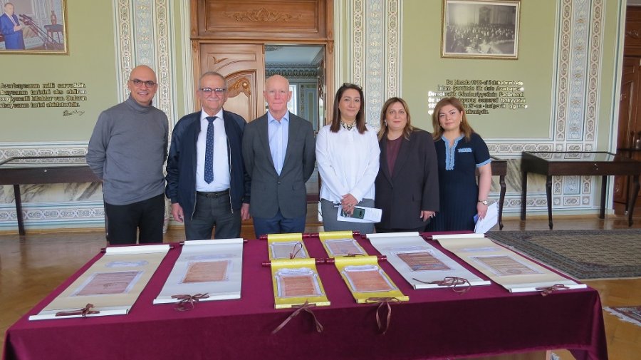 Daha sonra qonaqlara ekspozisiya zalında sərgilənən qədim və nadir əlyazma nümunələri, elmi-tədqiqat müəssisəsinin fondunda mühafizə olunan yazılı abidələr, nadir eksponatlar, UNESCO-nun “Dünya yaddaşı” Beynəlxalq Reyestrinə daxil edilən əlyazma nüsxələri, o cümlədən həmin siyahıya salınan Xurşidbanu Natəvanın “Gül dəftəri” illüstrasiyalı şeirlər albomu və s. barədə ətraflı məlumat verilib.