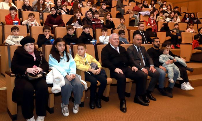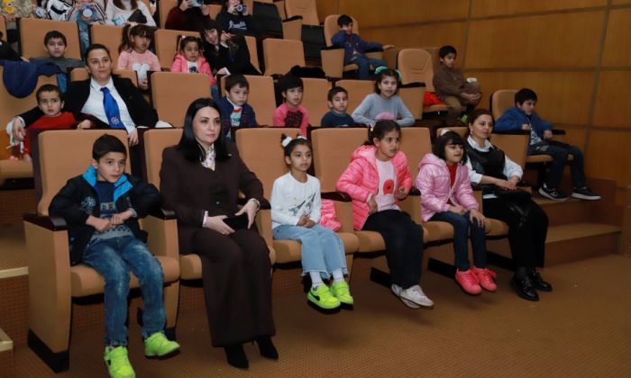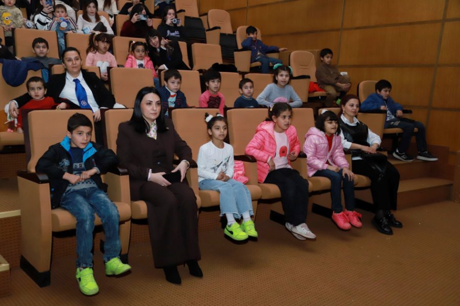 Şənlikdə iştirak edən uşaqlar “İnəkgül və Şimşəkgülün Yeni il macərası” nağıl-tamaşasına maraqla baxıblar.