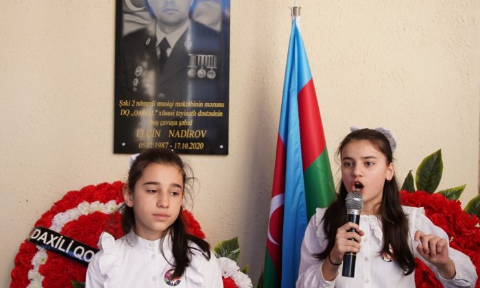 Şəki şəhər 2 nömrəli Uşaq musiqi məktəbində (Şəki-Zaqatala Regional Mədəniyyət İdarəsi) ölkəmizin ərazi bütövlüyü uğrunda mərdliklə döyüşərək şəhid olmuş Daxili Qoşunların hərbi qulluqçusu baş çavuş Elçin Nadirovun (1987–2020) xatirə lövhəsinin açılışı olub.