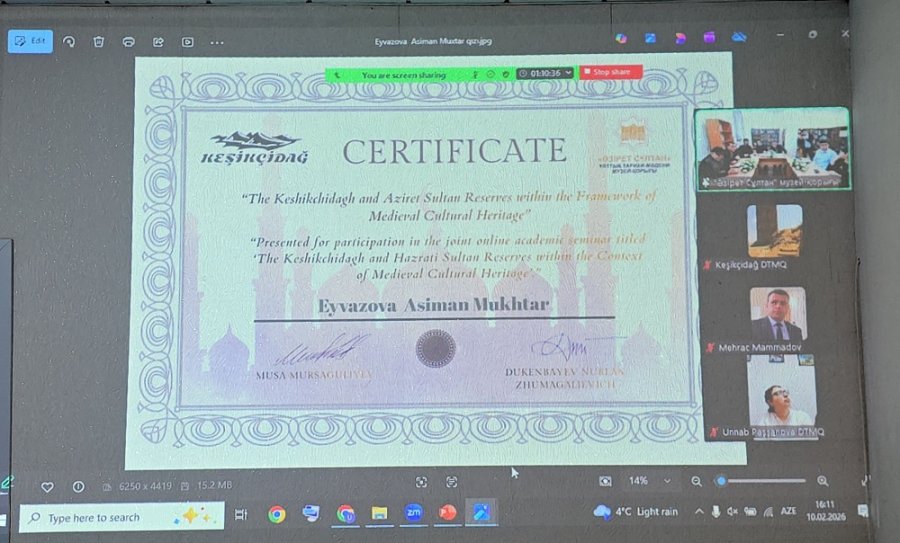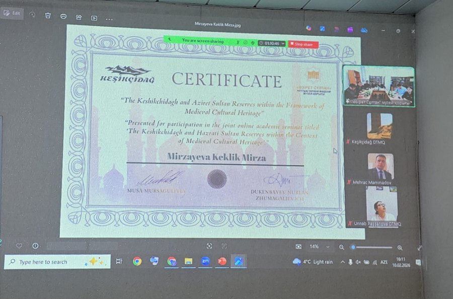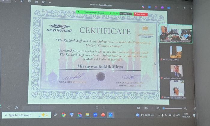 Onlayn elmi seminarda fəal iştiraka görə tələbə və magistrantlara “Keşikçidağ” Dövlət Tarix-Mədəniyyət Qoruğu ilə “Həzrət Sultan” Milli Tarix-Mədəniyyət Muzey-Qoruğu tərəfindən birgə sertifikatlar təqdim edilib.