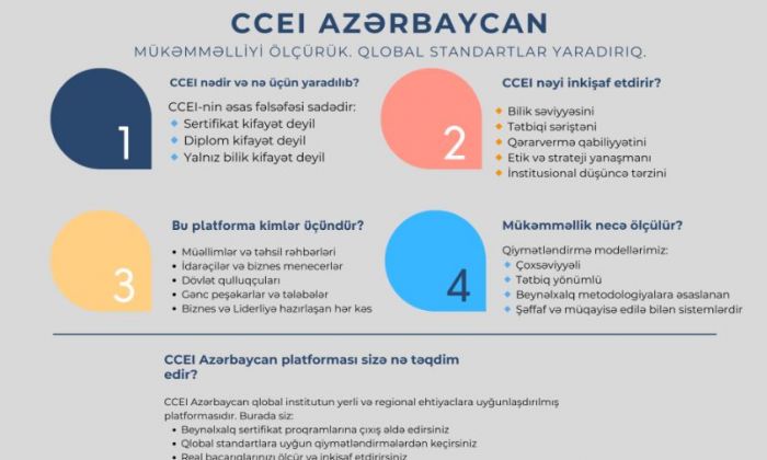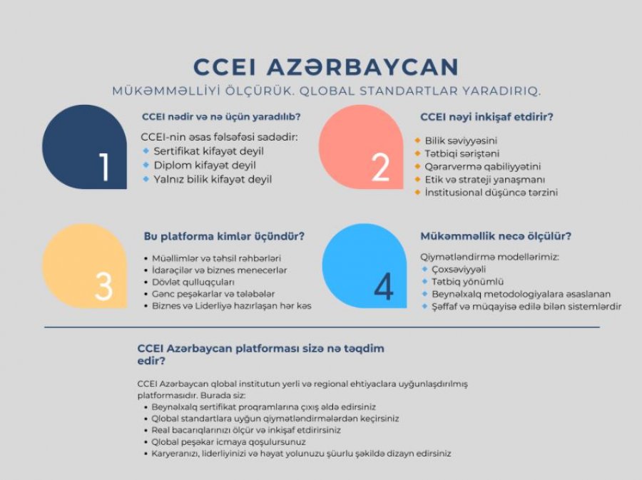 CCEI – mədəniyyət, təhsil, elm, dövlət idarəçiliyi, liderlik, innovasiya və həyat dizaynı sahələrində qlobal düşüncə, ölçülə bilən mükəmməllik və tətbiq olunan bacarıqlar üzərində qurulmuş beynəlxalq institutdur. Bu platforma bilik ötürmək üçün deyil, standart formalaşdırmaq, etibar yaratmaq və real peşəkar təsir üçün yaradılıb.