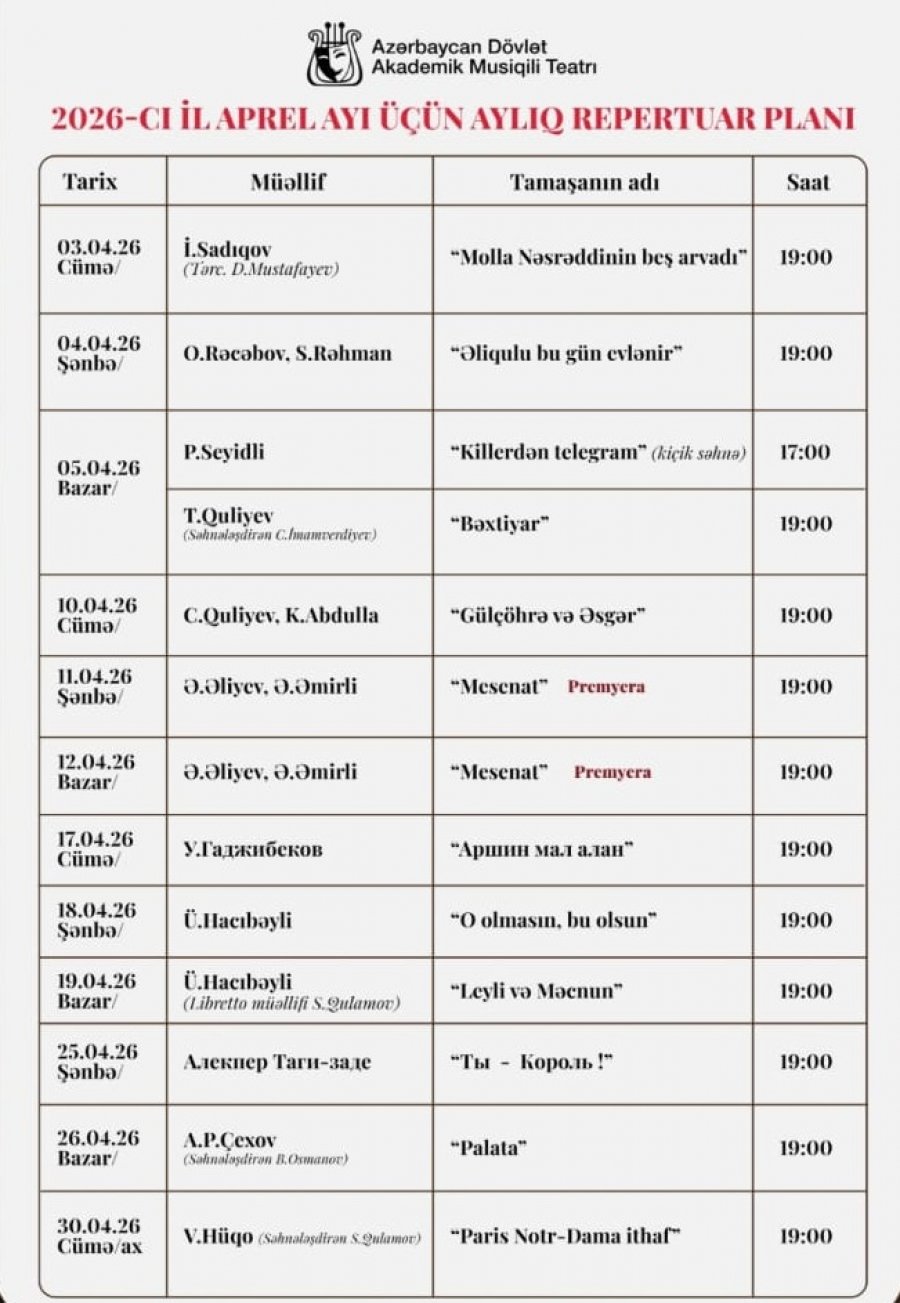 Akademik Musiqili Teatrın aprel ayı repertuarında “Molla Nəsrəddinin beş arvadı” (3 aprel), “Əliqulu bu gün evlənir” (4 aprel), “Bəxtiyar” (5 aprel), “Gülçöhrə və Əsgər” (10 aprel) və s. tamaşalar da var.