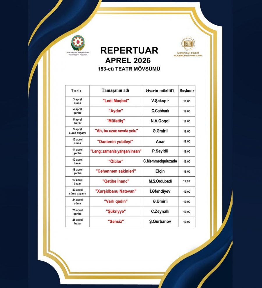 Bundan əlavə, aprel ayında Akademik Milli Dram Teatrının səhnəsində “Cəhənnəm sakinləri” (18 aprel), “Qətibə İnanc” (19 aprel), “Xurşidbanu Natəvan” (23 aprel), “Varlı qadın” (24 aprel), “Şükriyyə” (25 aprel) və “Sənsiz” (26 aprel) tamaşaları da olacaq.