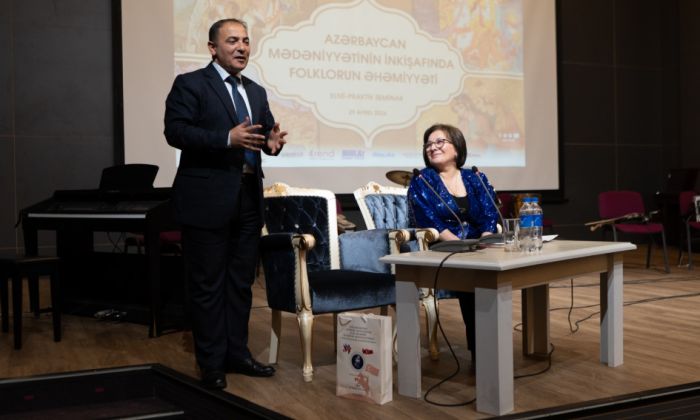MEMİM-in direktoru sənətşünaslıq üzrə fəlsəfə doktoru, dosent Vüqar Hümbətov çıxış edərək xalq yaradıcılığı, müxtəlif folklor janrlarının milli mədəniyyətin inkişafında mühüm rol oynadığını bildirib.